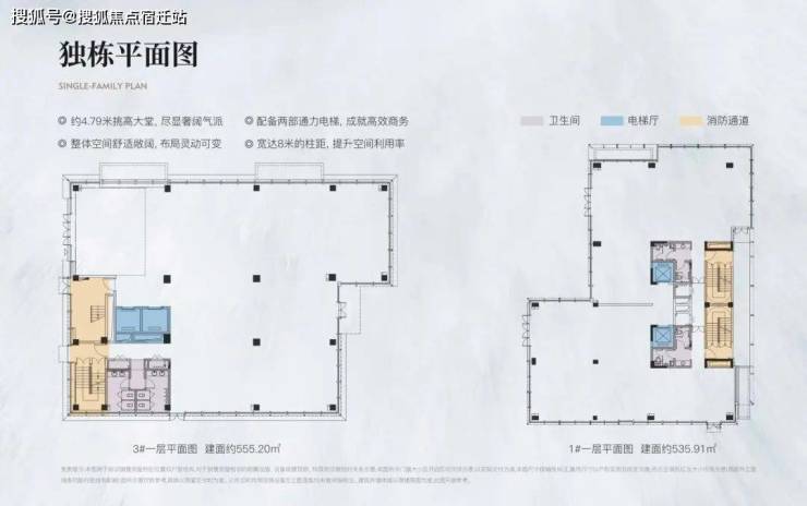 【层高】:一层挑高约4.8m,二到五层高约4.2m,打造开阔办公空间