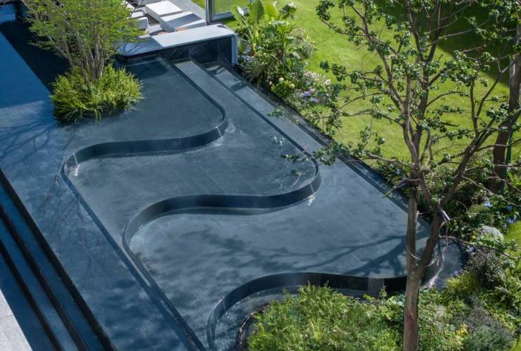形象取决于空间,设计在花园里做的不仅仅是水,而是创造空间,让其流入每栋建筑,并可以带领人们从一个地方到另一个地方。水没有任何颜色,但如果把深色物质放在水下,它就会变成镜子,这也是设计想将建筑整合进水中的创意。