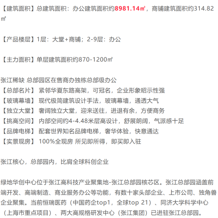 【张江核心】【现房办公】【企业总部级整栋办公】【花园绿境】【约4-4.48米层高】【全玻璃幕墙】