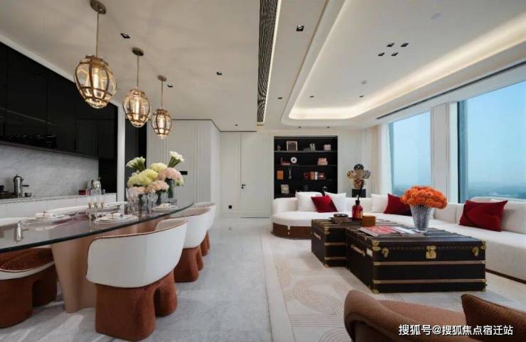 约230㎡样板房,约10米的巨幕落地窗将光与景大篇幅引入室内。双主卧的配置,给不同家庭成员同等尊贵的空间感。