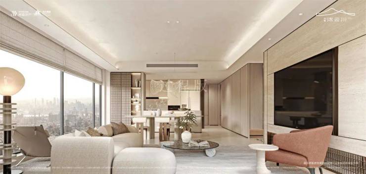 LDKB一体化设计,将餐、厨、客厅、阳台四大空间统筹规划,在住宅空间里创造出一种大平层的「派对化家庭聚场」,南向面宽达到了约10.3米,270°双面采光的宽厅,为生活打开超广角视野,与室外景观交融。