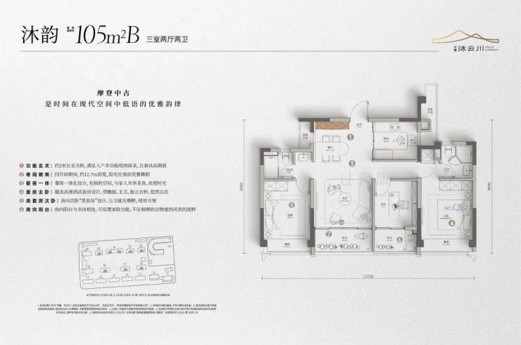 比如建面约105㎡B的摩登中古风,三室两厅两卫户型,四开间朝南,约12.7米的面宽,让更多的阳光洒进屋内。