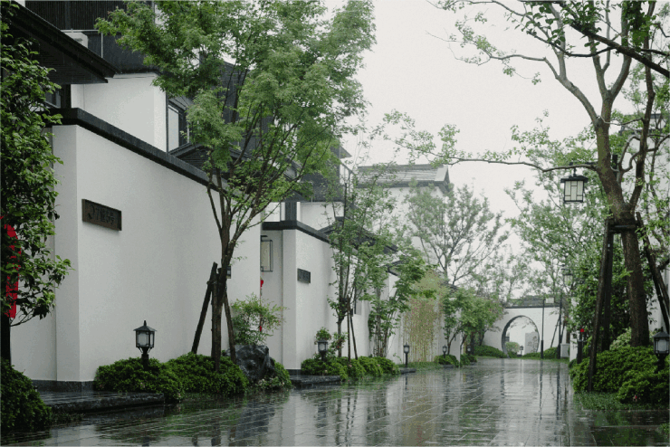 当你独坐露台或室内,玻璃幕墙、栏杆,丝毫不会影响你的景观视野;独门独户的院子里,有煮茶空间、 花道空间等,饮茶、插花、下棋或会客,可满足文人雅士般的归隐生活;当你徜徉在巷道里,两道深墙之间, 一条树木掩映下的林荫夹道上,偶遇一块精致的石头、一棵精致的树,转头又能看见一扇樱花点缀的花窗画景......