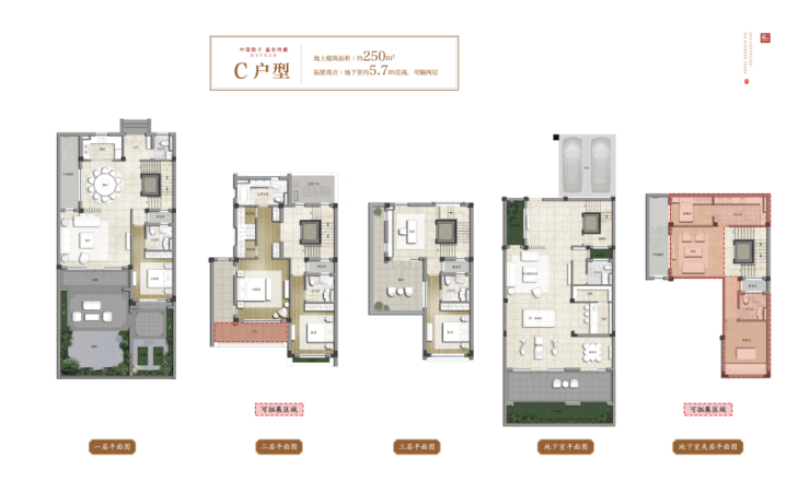 这种大宅的丰赡感,一直从园林延展到了室内。禾原组团的户型,都预留电梯井,大部分卧室都采用套房设计。凡是一楼设计了老人房的,必是带卫生间的套房,对长者特别友好。以约250㎡C户型为例,开间约9.6米,做到了整整4个套房+1个书房。