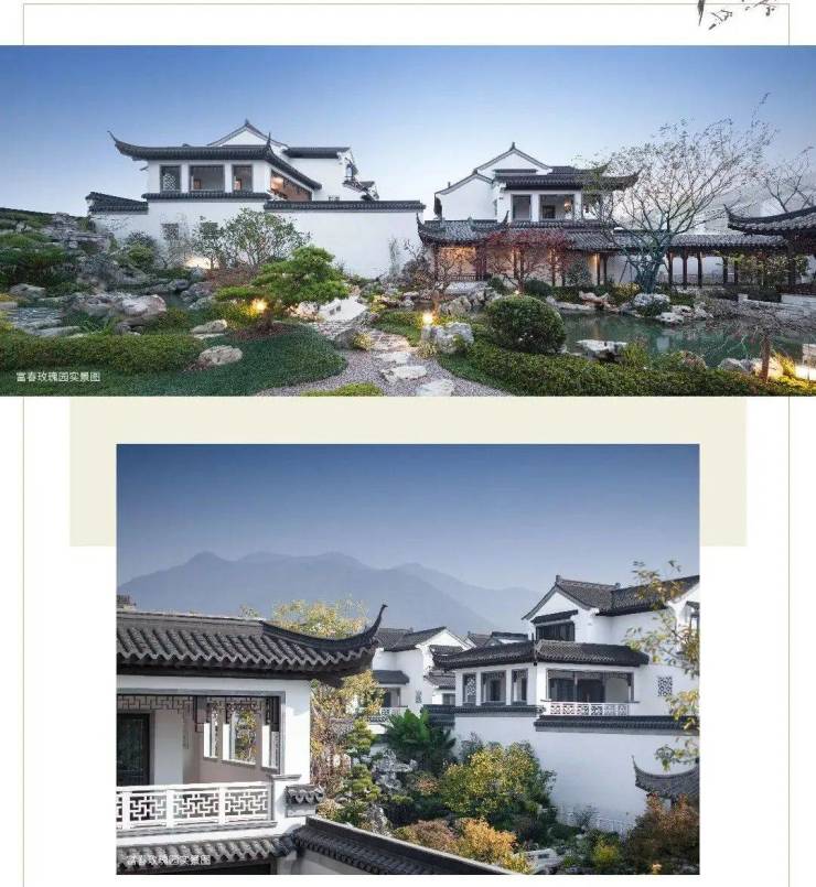 富春玫瑰园中国院子除传承绿城中式产品中的青瓦白墙、飞檐庑廊、影壁漏窗、水榭亭台等中式建筑元素外,为了不辜负从《富春山居图》中走出来的山水大境,在设计上我们还原苏州园林【园院宅阁】体系,极大限度的将富春山水收藏入室。