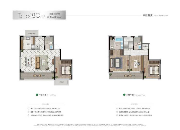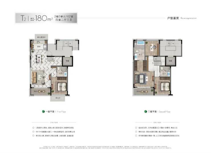 下叠主力户型约180㎡四房三卫,大面积落地玻璃,户型窗墙比超60%,通透敞亮;每户均带南向庭院(约50-60㎡,部分可达100㎡),并创意性做了地下空间。