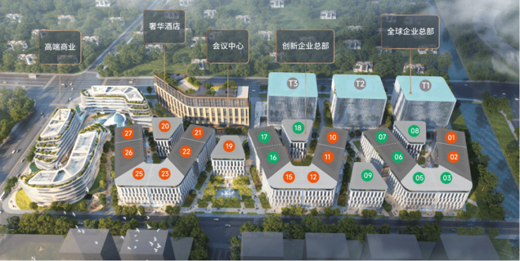 基本参数:占地约7万方,建面约34.5万方,自持60%,由23幢独栋办公、3座甲级办公与1座商业、1座酒店组成
