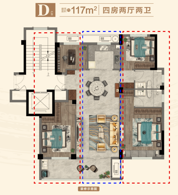 此D户型这是近两年非常风靡的经典户型,方正四房+双联阳台,因为舒适度一流,因此可以称为“巨型四叶草”。