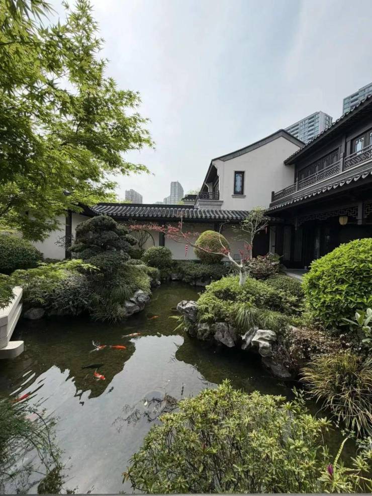 最令人称道的是细节的极致打磨:巷弄汀步选用老巷弄石材保留原始青苔,锦鲤池配备专业水处理系统,连车库支撑柱间距都达到13.8米(可容纳千万级房车)。这种"无处不定制化、手工化"的营造态度,让荷院不仅是居所,更是可传世的建筑艺术品。
