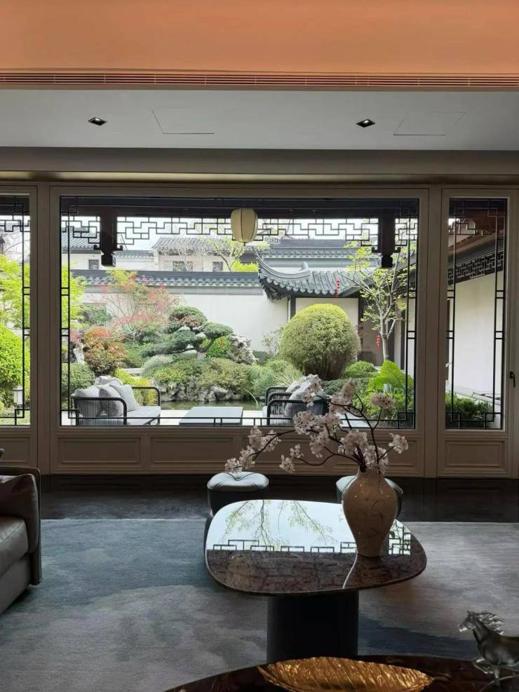 项目以"江南风雅"为景观核心理念,依托天然河道打造300米活水景观轴,两座古风廊桥横跨其上,木作全部采用非洲柚木与俄罗斯铁杉木。东区、西区各设2个中心庭院,单太湖石用量即达1100吨,通过"芝花海棠"花街铺地、叠水飞瀑、老树婆娑等元素,再现"一步一景,步移景异"的苏式园林精髓。