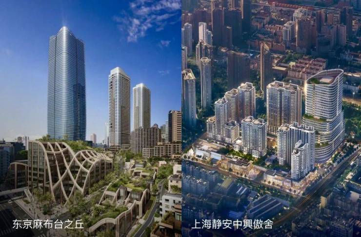 左侧为东京麻布台之丘示意图,非项目图片,仅作为学术展示;右侧为中興傲舍效果示意图