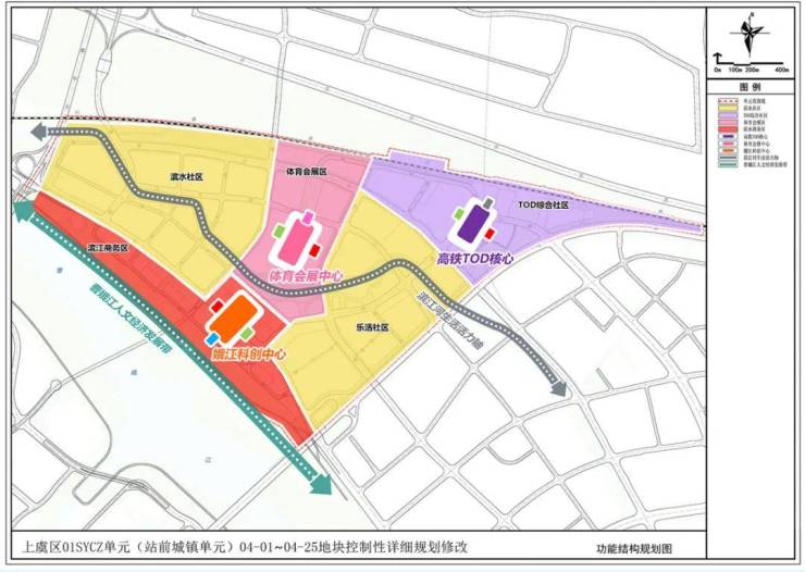 其中,作为上虞一江两岸的首发区和核心区,高铁新城片区将形成“一带一轴、三心多片”的结构体系,致力于成为上虞对外交流的城市门户和新窗口。沿江将建设企业总部集群,体育中心的对面还会有地标性建筑(娥江之星)。