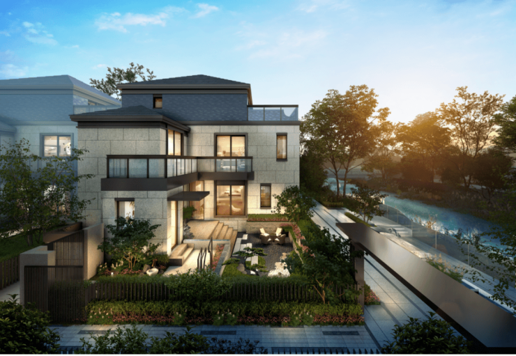 【上实·和风院】建筑外观是新中式格调,以黑色面瓦为黛顶,整体线条简洁明快。