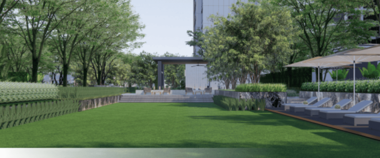 而「林间客厅」中丰富的座凳、桌椅等空间,同样带来家庭理想生活的向往,散步、休憩、嬉戏,自然惬意在这里被扩大。开放式设计的「微风草坪」,大片开阔的草地在暖光的照耀下,诗意不言而喻,原始的自然净雅之美尽显于此。
