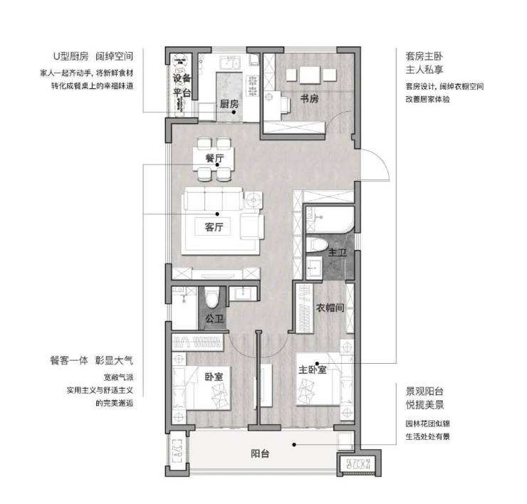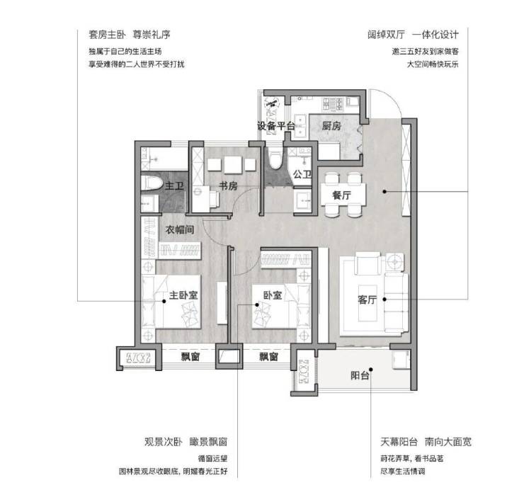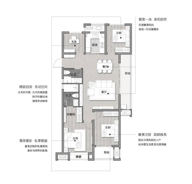 云起峰境建筑面积约106㎡云·尚户型,宽幕阳台的打造既拉伸了生活的尺度,还体现了生活的质感。只需静坐即可沐浴阳光,欣赏园林风景。阳光漫漫,幸福满满,生活至此恰到好处。