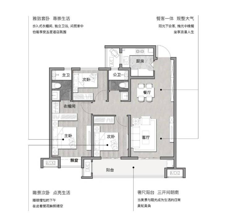 人对阳光的渴求,让南向开间的数量成为考量一个户型好坏的重要标准。云起峰境建筑面积约125㎡户型以三卧朝南格局,毫不掩饰对光的迷恋与向往,让阳光在室内肆意游走,成为向阳而生的人居典范。