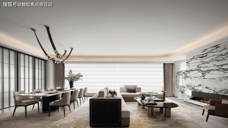 步入玄关处,以一整面森林绿大理石背景墙做视觉隔断,搭配两侧艺术造型的皮革硬包,观感上既没有大面木质隔断的厚重,又不失新中式应有的华丽。当然,木材在新中式产品打造过程中依旧不可或缺,因此缦云仍在玄关处打造了大量木饰面,并采用海棠花腰线设计来提升饰面美感。