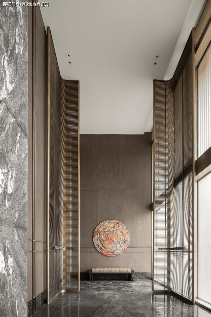 私密空间则由一道移门进行分隔,移门把手采用中式传统的敲铜工艺,每一条复杂的纹路与凹凸,均由纯手工反复镪打而成。尽管只是点滴细节,也起到了强化新中式内核的大作用。