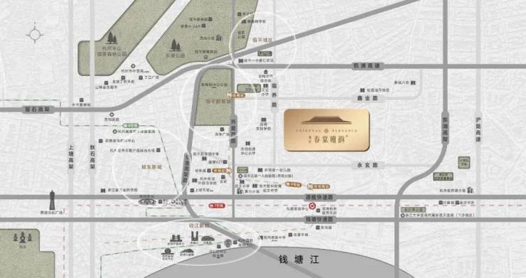 还有东湖高架、永玄快速路、迎宾路组成的“两纵一横”黄金走廊,到杭州三大宇宙中心——武林、钱新、奥体都是四通八达的。
