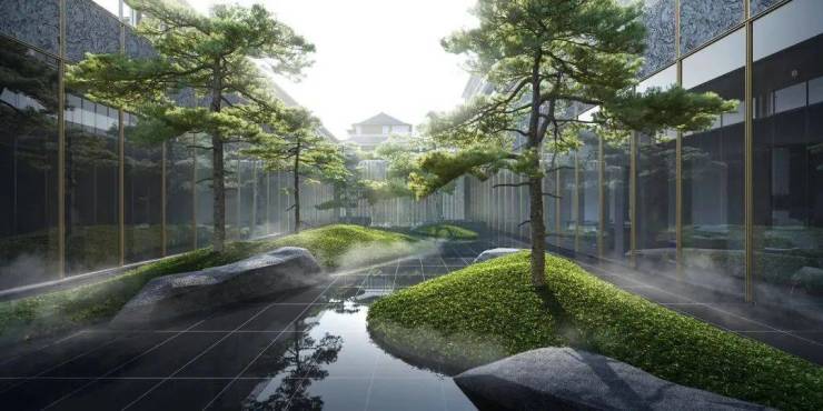 比如园林景观,就是深研宋式造园手法,进门就是一幅总长约70米的山水街影图,园区中提炼名画中的山峦、流水、飞瀑、水榭、苍竹等元素营造,还有复现宋风美学的“归家九序”的回家仪式感,尊崇感拉满。