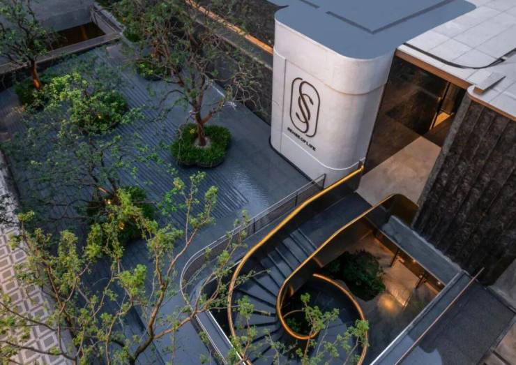 建筑由九米设计操刀,通过运用黄金比例分割、斯卡帕序列叠级等经典元素再现“黄金时代”的审美。运用皇家白玉石材等现代材质,方正通透,符合现代审美。外立面四面浅色铝板搭配香槟金线条、大面积蓝灰色玻璃,颜值非常高。