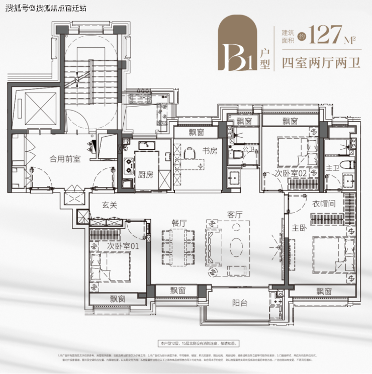 来看看更大一点的户型——建面约127㎡超阔四房,同样是南向横厅设计,并拉伸至4开间,空间舒阔。主卧套房设计,也有足够的收纳,打造专属秀场。