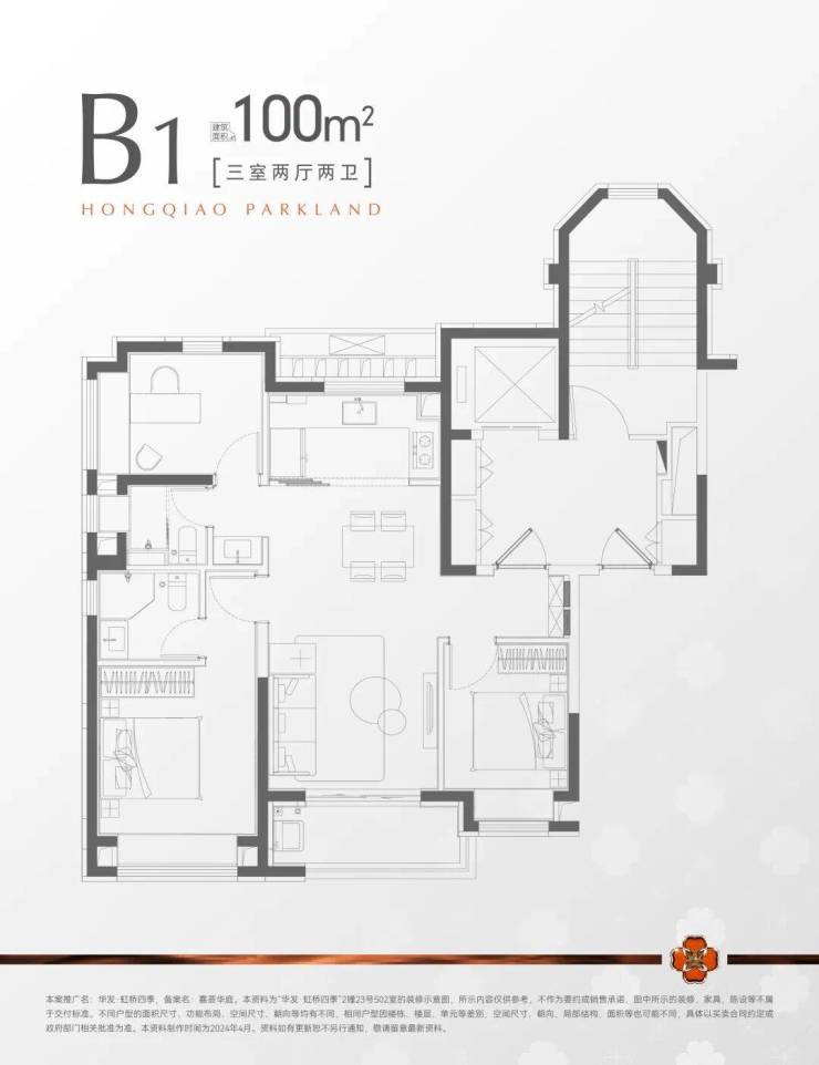 (2)建面约100㎡3房2厅2卫,空间尺度再进化