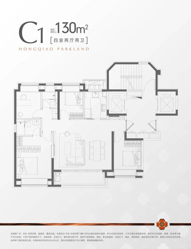 建面约130㎡四房两厅两卫,以舒阔尺度和人性化设计,为多代同堂家庭呈现理想生活的范本。
