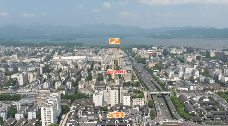 定福阁已基本完成建设,尽管还不能入内参观,但通过外立面,可以看出建筑的中式韵味,与传统中式建筑不同,定福阁的飞檐椽角都现代简约化,花窗纹路等细节的刻画又一秒间穿越回过去。在定福阁众多的标签里,最让人心动的莫过于它与西湖的直线距离只有约900米。