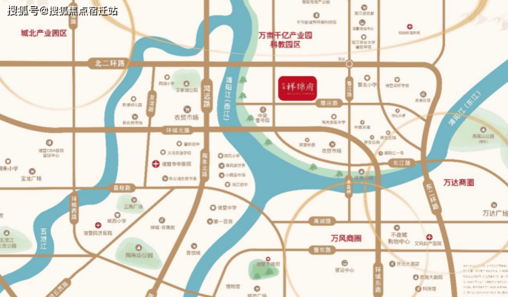 祥锦府,地处诸暨城北核芯片区,南临环城北路,北接北二环路。2KM内醇熟商业、鲜氧生态、人文学府、优质医疗等多元生活配套环绕。如:郭家农贸市场、城北新农都、奥特莱斯,新妇保医院、浦阳江公园、体育公园等,一站式生活主场,就在家门口。