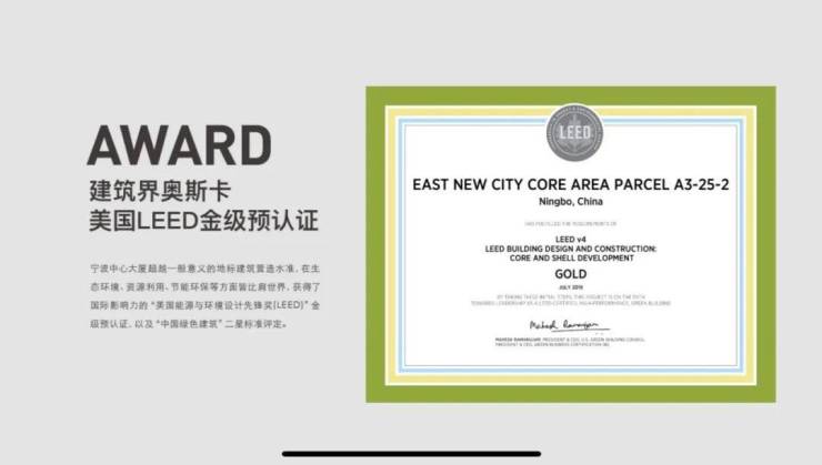 建筑界奥斯卡美国LEED金级预认证,宁波中心大厦超越一般意义的地标建筑营造水准,在生态环境、资源利用、节能环保等方面皆比肩世界,获得了国际影响力的“美国能源与环境设计先锋奖(LEED)”金级预认证,以及“中国绿色建筑”二星标准评定。