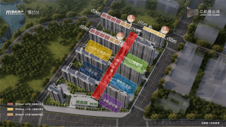 象屿路劲·都匯云境由国企象屿地产和港企路劲地产双巨擘联袂打造。项目社区景观打造强调均好性和邻里共享,以一条中央景观轴,串联5大景观公园,让业主在每一个角落享受放松与悠闲。约150m中轴主干道,是艺术归家之路,也是慢跑健身之路,南北贯通整个社区,串联五大主题园林。
