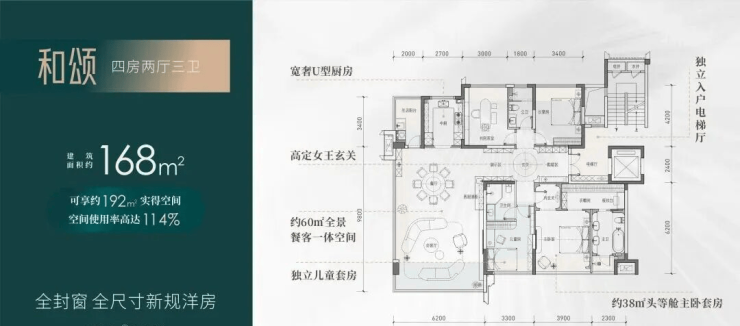 【四房两厅三卫】建筑面积约:168㎡;实得面积约:192㎡;实际得房率114%;相当于旧规226㎡!(旧规户型按85%得房率计算,仅供参考)