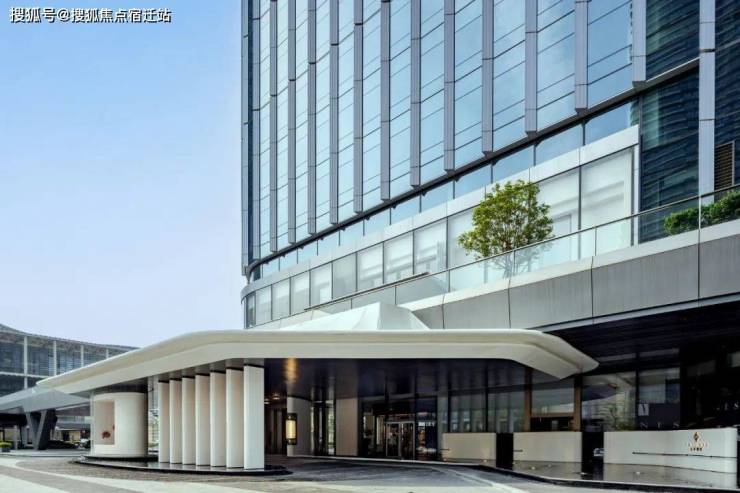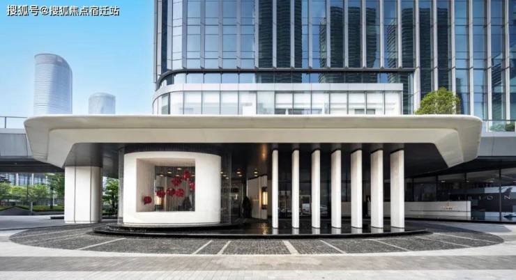 门厅的白色铝板顶面向街区延伸,成就轻盈高贵的迎宾氛围。临街的地面水池由黑金花石材铺就,7个贝特白石材立柱于刻意组合中形成琴弦意向,动静有时,行藏有节。