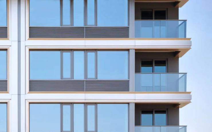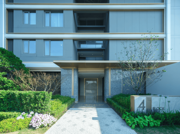立面上还用金色铝板线条勾勒出窗框,而且做了工艺更复杂的斜切设计,像是给每幢楼都镶上了一个个「金框」,既有辨识度也充满贵气。