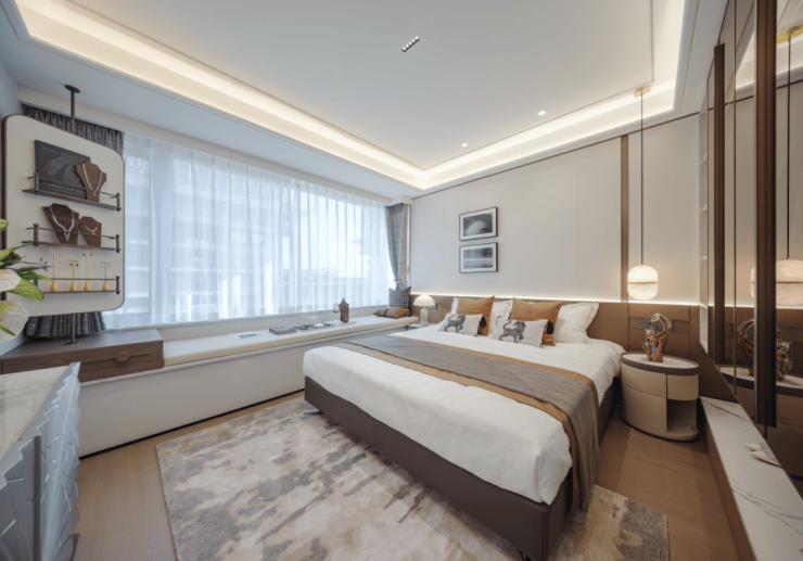 整个项目的建筑、景观、室内相互影响。在建筑设计中,确实展现出了室内外交织的空间特点,这种设计不仅增强了建筑的交互性,也使得建筑与景观之间形成了和谐而富有层次的关系。执笔过无数豪宅的设计天团GLA(建筑)+GTS蓝颂(景观),保证了璞御栖湖府的审美品质。