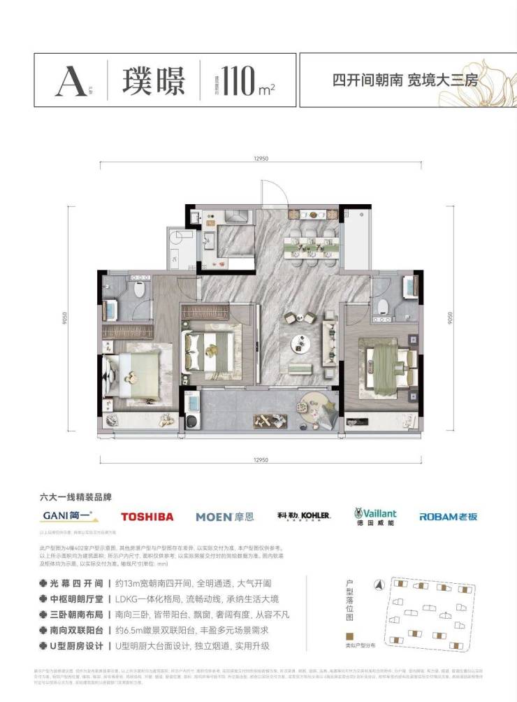 建面约110㎡户型,市场面上罕见的四开间朝南,南向面宽达到近13米,朝南的三个卧室,每一个都配上了飘窗或阳台。