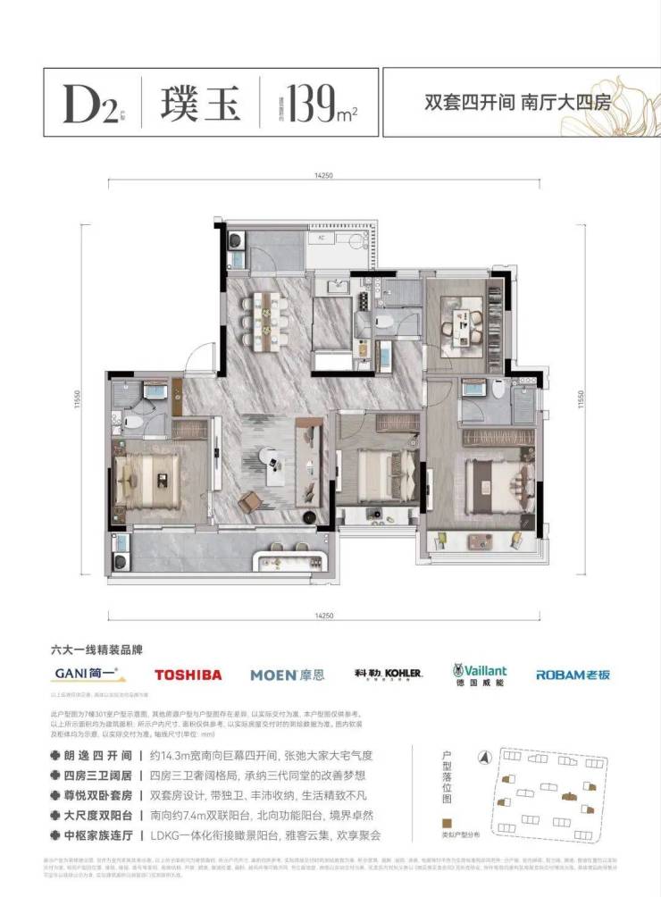 建面约139㎡户型,四房三卫,东西各有一个套房;餐客厅一体,公共区域非常大,而且还是南北双阳台;南向开间约14米3,完全是大宅尺度,三代同堂居住也不会拥挤。