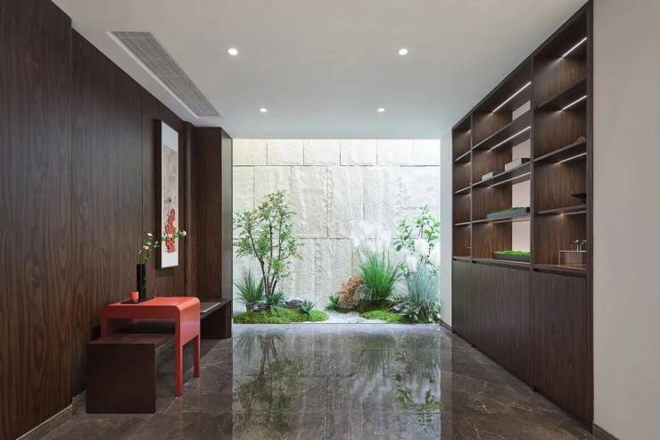 在会所中央,设计了充满中式韵味的四水归堂:屋檐四面围合,中间种植舒展松树,承载着中国传统文化中“天人合一”的理学思想。雨季时节,水从四面的檐壁汇聚,寓意着财源风水,也寄托着家人团圆的美好愿望。