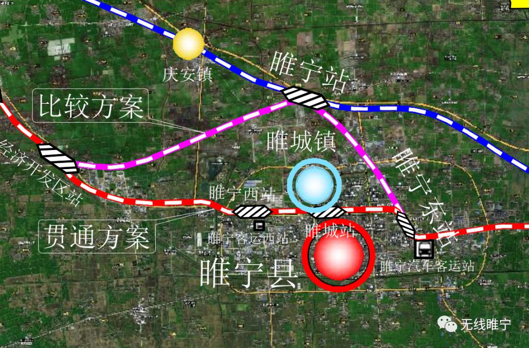 徐睢宿市域铁路睢宁段起自徐宿淮盐城际铁路观音站,线路沿G104国道走行,到经济开发区后,在睢宁县内分两个方案比选。