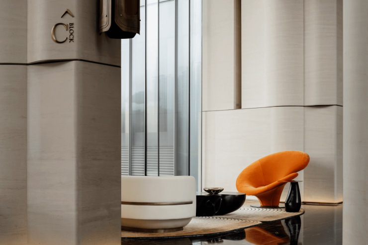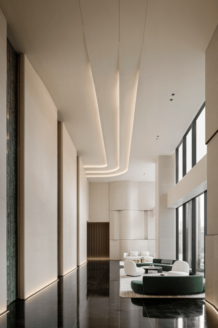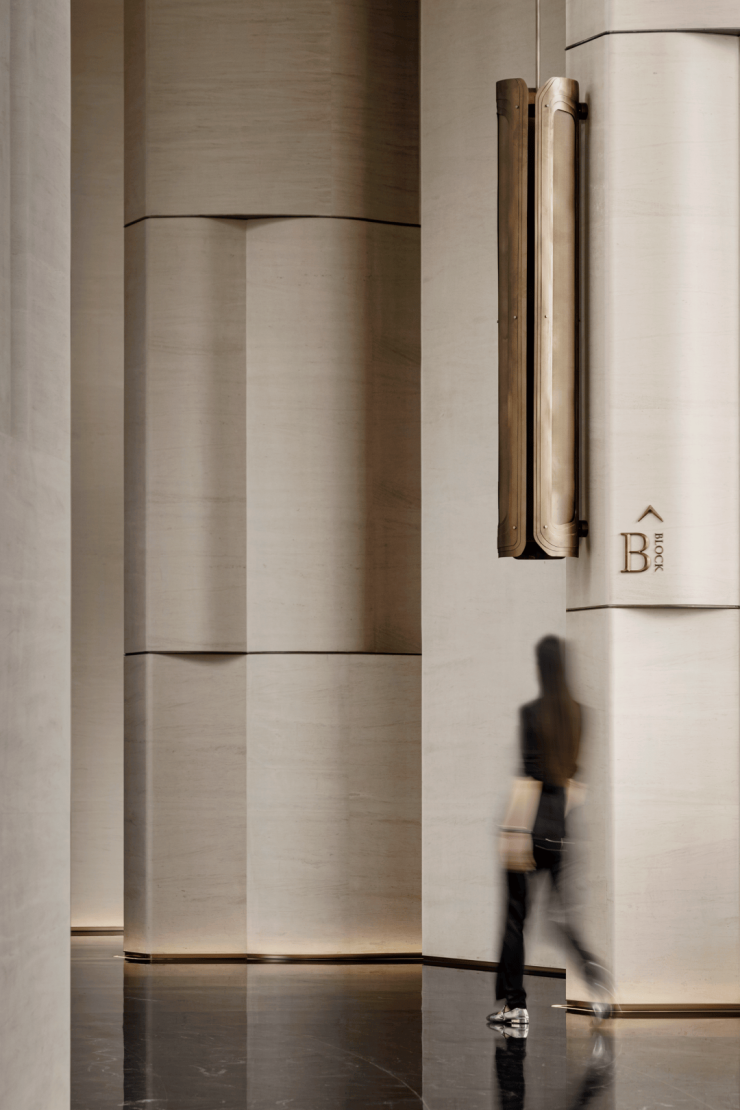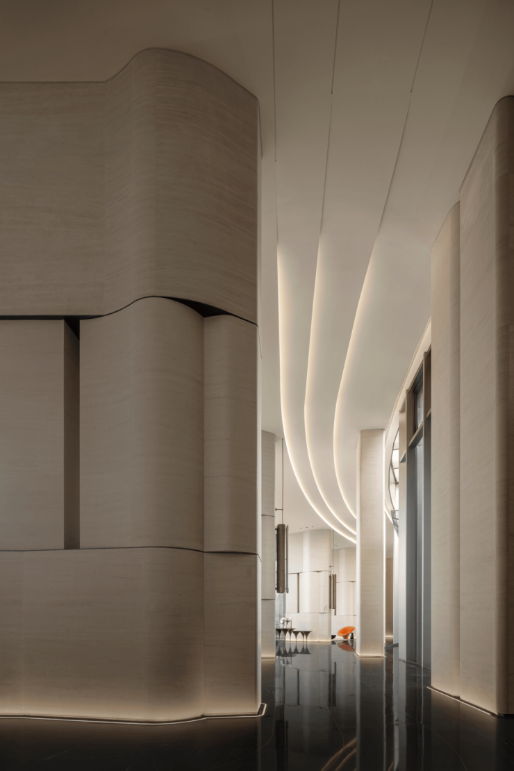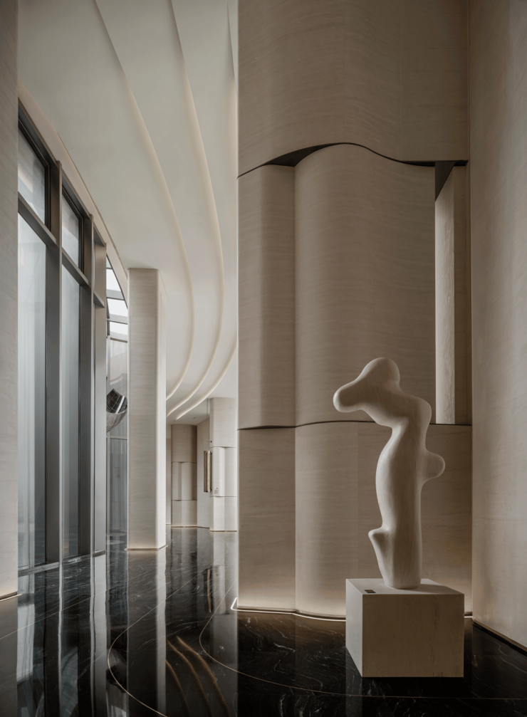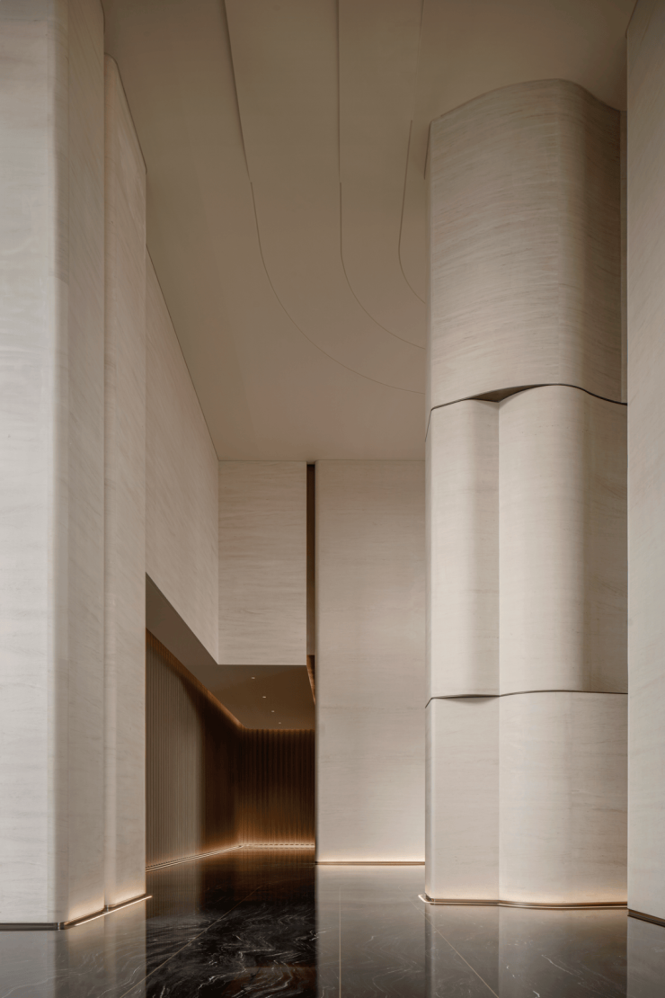柱体立面以淡雅洞石铺陈,家具则巧妙汲取自然界的延伸色调,宛如山水云游间自由流淌的韵律,引领着人的心灵步入一个静谧而深远的世界。