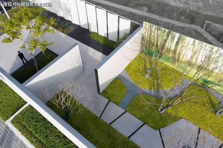 在建筑与自然之间建立微地形景观,前庭院空间以折线式和自然式地形展开,利用景墙隔绝外界喧闹吵杂的环境,逐渐进入一个静谧的密林空间。