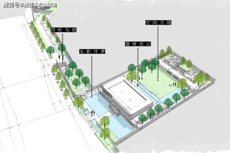 整个展示区景观空间主要包含四大主题场景,设计方式在于解决展示区面积的局限性,在设置浏览动线时,前场加强折线的体验感,由曲折到开阔,后场则以“水树”之意表达静谧。