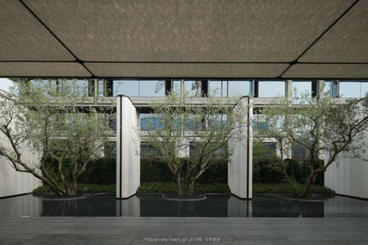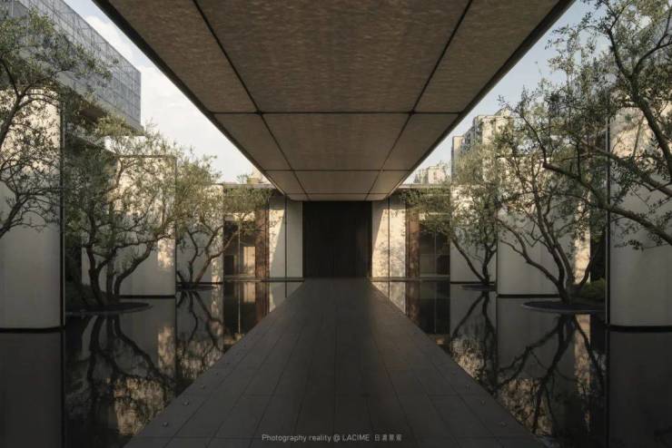 招商玺是整体大区抬高 4 米的设计,在归家那一刻就建立私属的感受。经由前厅的紫铜照壁,走到背后便是直达大区地面层的电梯,电梯开门便可感受扑面而来的秘境。两侧礼序景墙界定着归家水院的尺度,六颗油橄榄层层递进,经年累月展示异域风华,树宅相守的传统居住文化再度相生,秩序与韵律则成为了空间的主旋律