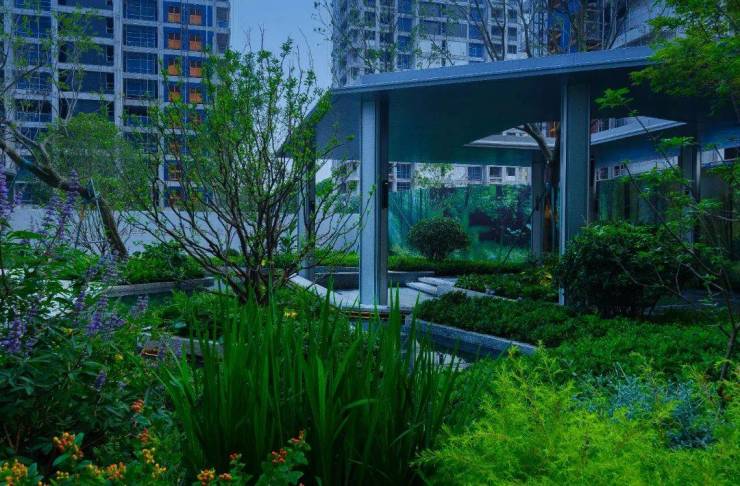 在景观打造上,同样可圈可点:项目园林以“一廊三心九园”的规划理念出发,构筑前文说到的风雨连廊、三大主题架空层、九大口袋花园等,以园区中央超5000方的“社交会客厅”为例,涵盖了草坪、茶亭、水景花园等不同功能模块,并连通三大架空层,这样做的好处在于能同时间创造出更多的生活场景。