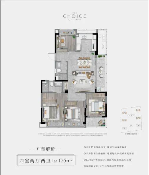 125㎡四房两卫同样是边套:三个卧室均排列在南侧,充分实现了“阳光平权”,每个家庭都可以沐浴在阳光中醒来。LDBK一体化的公区,充分实现了家庭成员间的互动;除了边厅外接的阳台外,南向次卧同样设计了阳台,兼顾了景观和晾晒的需求。