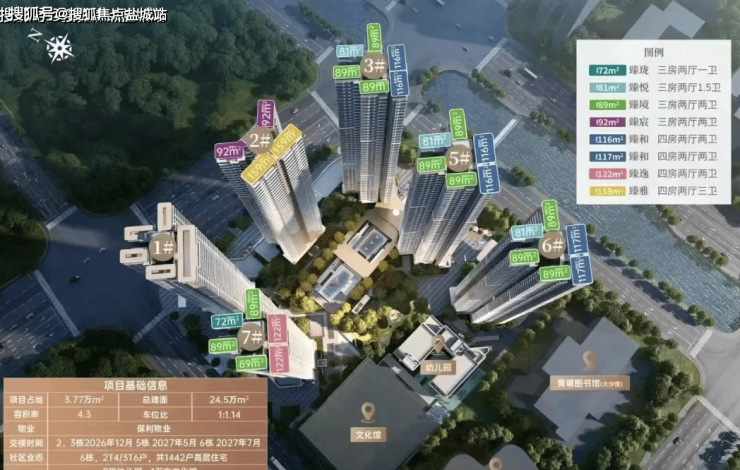 保利招商华发中央公馆采用了围合式设计,6栋47层高塔楼设计,小区自身配建有文化体育场馆和幼儿园,除了2#楼王是两梯四户,其余均为三梯六户,8#是5层高的文化馆,9#是配建3层高的幼儿园。