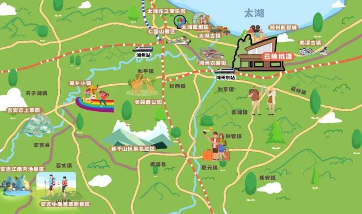 📍三、以项目为中心,辐射1小时游玩范围,有太湖旅游度假区、南浔古镇、湖州长颈鹿庄园、西山漾湿地公园等,涵盖了自然、文化、亲子、休闲等多种类型的游玩地点。