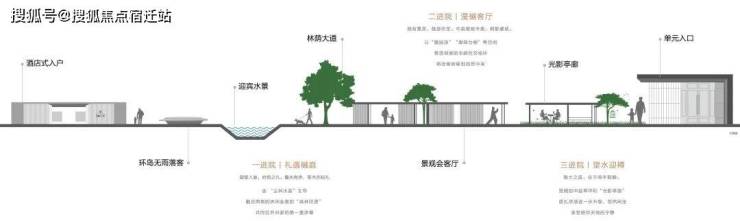 半围合式布局的景观规划,利用外围高层的公建化立面重塑周边城市界面质感,也是适宜中国人的生活方式和对“家”的想象;中心区域的洋房组团位于中线礼仪轴两侧,望水迎樽、漫樾客厅、礼遇樾庭三进院落空间,由南向北整齐规制、有序递进。