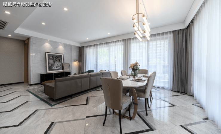 下叠四房两厅三卫的设计。一层南向整体面宽约10.8米,餐客厅一体,连通约7.2米的长阳台,大横厅与落地窗的搭配,增加了室内空间与庭院的互动。